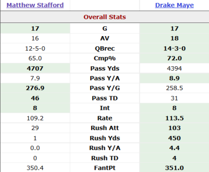 I now present to you the statistical comparison between Matthew Stafford and Drake Maye. Like Raliegh, Stafford is better in the counting stats categories, but not in efficiency metrics or AV, which is ProFootballReference’s value metric.