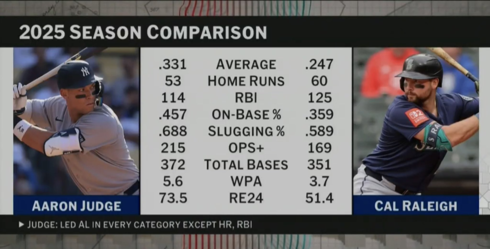 This was the MVP race in the most recent MVP season. As you can see, Cal Raleigh had a great year, leading the MLB in home runs and RBIs. 30 years ago, he probably would have won MVP, but not today, when we have a better understanding of the game. We now know that those efficiency metrics (OBP and Slugging) and value metrics (WPA and RE24) are more important in player evaluation, making Judge the clear choice.